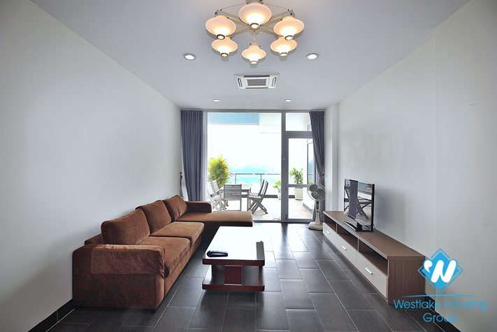 Lake view apartment in great location of Tay Ho, located in a beautiful lake side road of Quang An street, easy access to Ha Noi centre, near many local shops, bars, restaurant, shopping mall... With the size of 200 sq.m, this property offers 03 good sized bedrooms, 03 bathrooms, bright lounge, fully fitted kitchen combined with dining area. Besides, this one also has a large balcony with great view of Westlake. The apartment is fully furnished and equipped with high quality furniture and modern appliances. Please contact us to arrange a viewing !